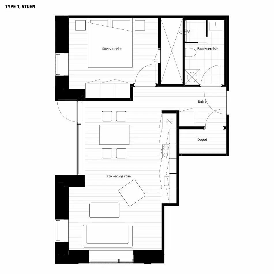 Køkken og opholdsrum ligger samlet i et stort og lyst køkken/alrum med stilrene moduler og kvalitetshvidevarer. De store vinduespartier giver et behageligt lysindfald, og der er direkte udgang til altanen, som har god plads til udeliv i sommerhalvåret.