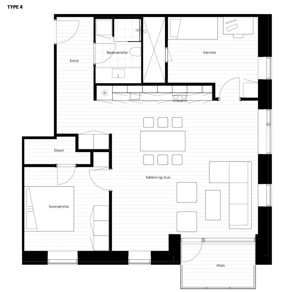 Køkken og opholdsrum ligger samlet i et stort og lyst køkken/alrum med stilrene moduler og kvalitetshvidevarer. De store vinduespartier giver et behageligt lysindfald, og der er direkte udgang til altanen, som har god plads til udeliv i sommerhalvåret.