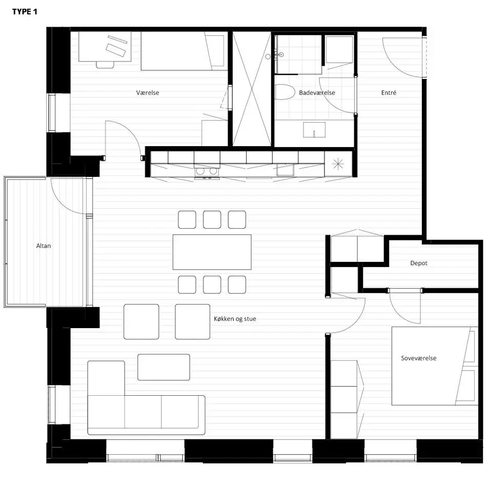 Køkken og opholdsrum ligger samlet i et stort og lyst køkken/alrum med stilrene moduler og kvalitetshvidevarer. De store vinduespartier giver et behageligt lysindfald, og der er direkte udgang til altanen, som har god plads til udeliv i sommerhalvåret.